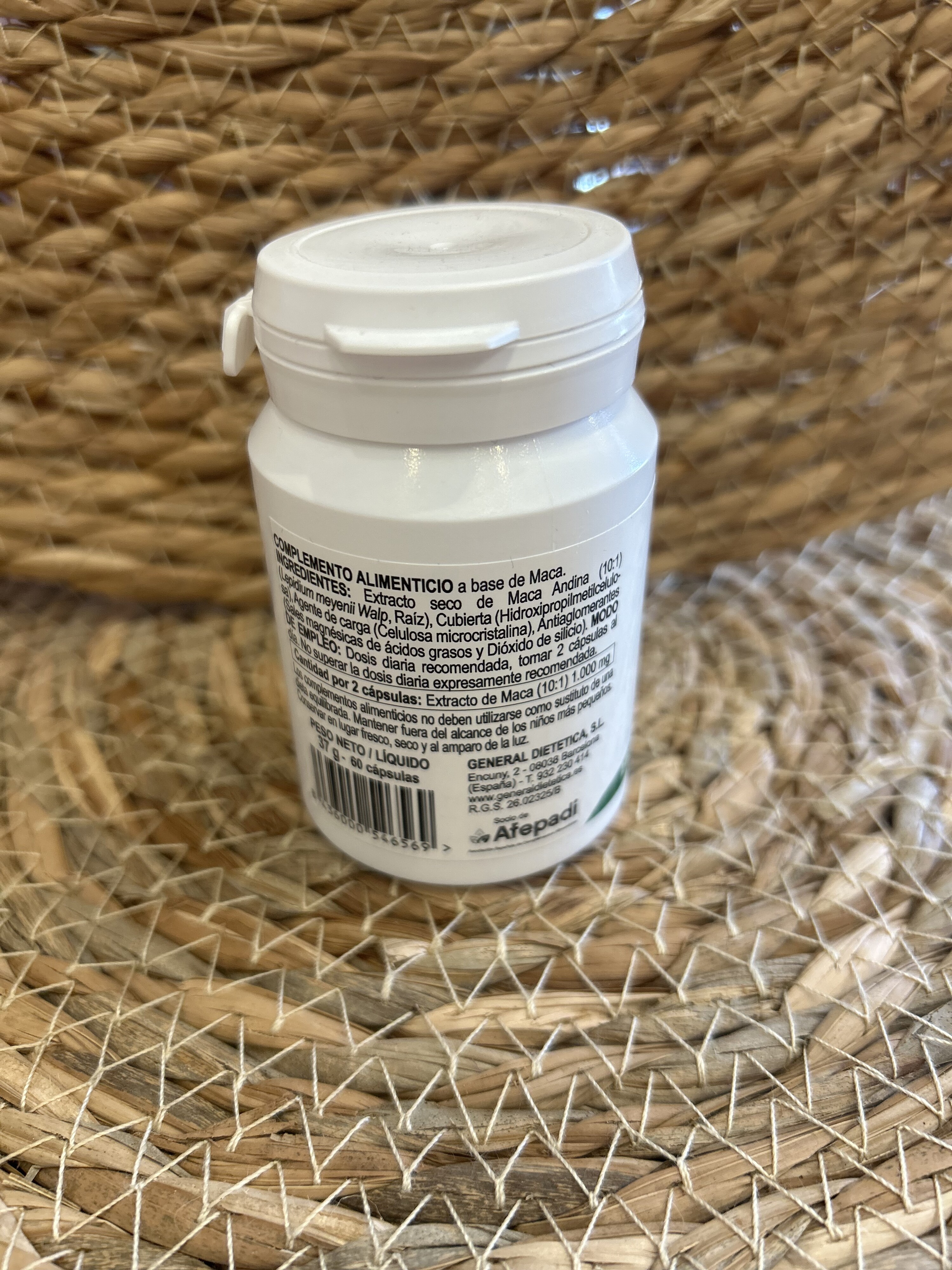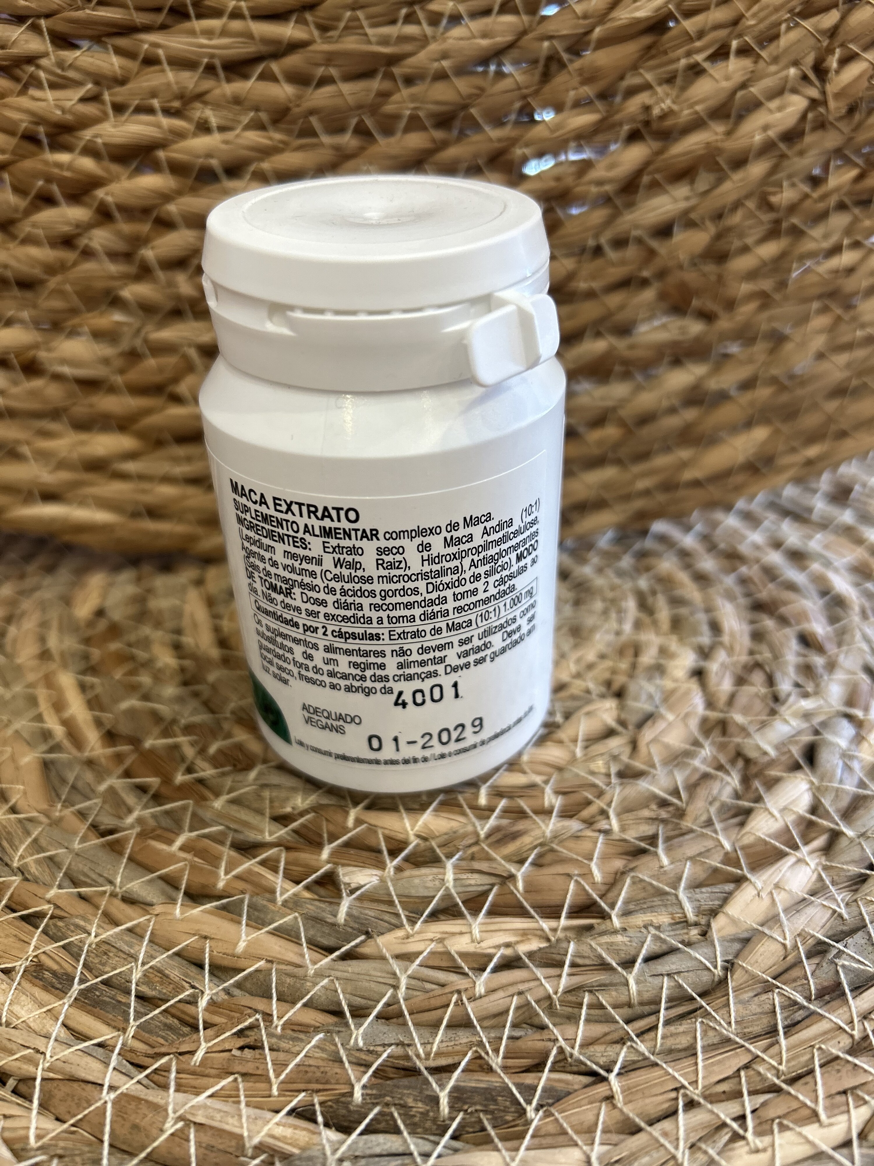 Ingredientes: extracto seco de Maca Andina (10:1) (lepidium meyenii Walp, Raíz), cubierta (Hidroxipropilmeticelulosa), agente de carga (Celulosa microcristalina), antiaglomerantes (sales magnésicas de ácidos grasos y dióxido de silicio).