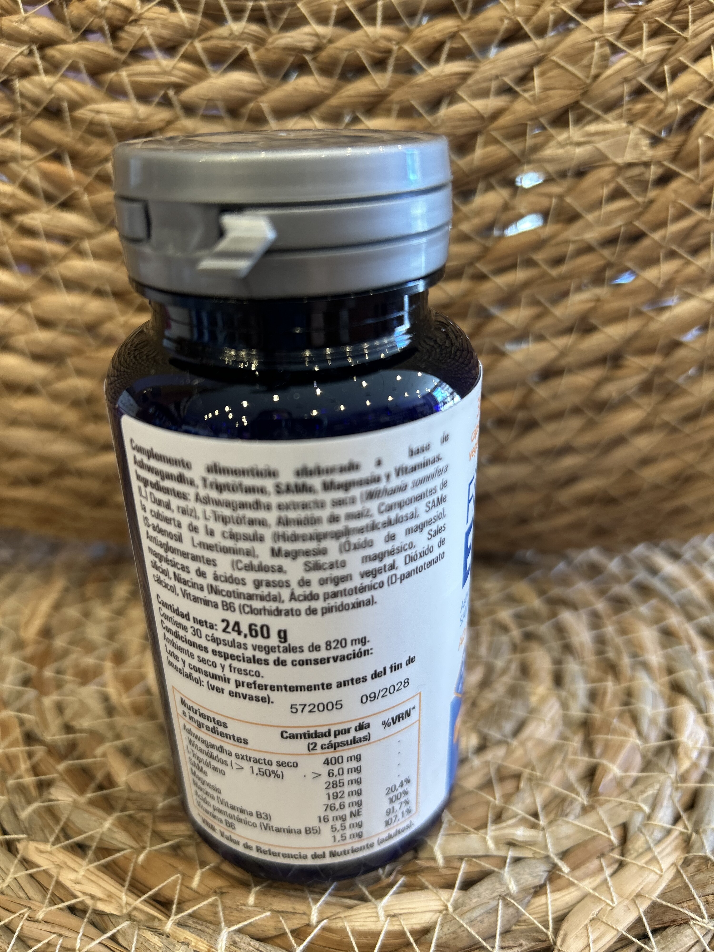 Ingredientes: Aswagandha extracto seco (Withania somnífera (L.) Dunal, raíz), L-Triptófano, Almidón de maíz, Componentes de la cubierta de la cápsula: (Hidroxipropilmetilcelulosa), SAMe (S-adenosil L-metionina), Magnesio (Óxido de Magnesio), Antiaglomerantes (Celulosa, Silicato magnésico, Sales magnésicas de ácidos grasos de origen vegetal, Dióxido de silicio, Niacina (nicotianamida), Ácido pantoténico (D-pantotenato cálcico), Vitamina D6 (Clorhidrato de piridoxina).