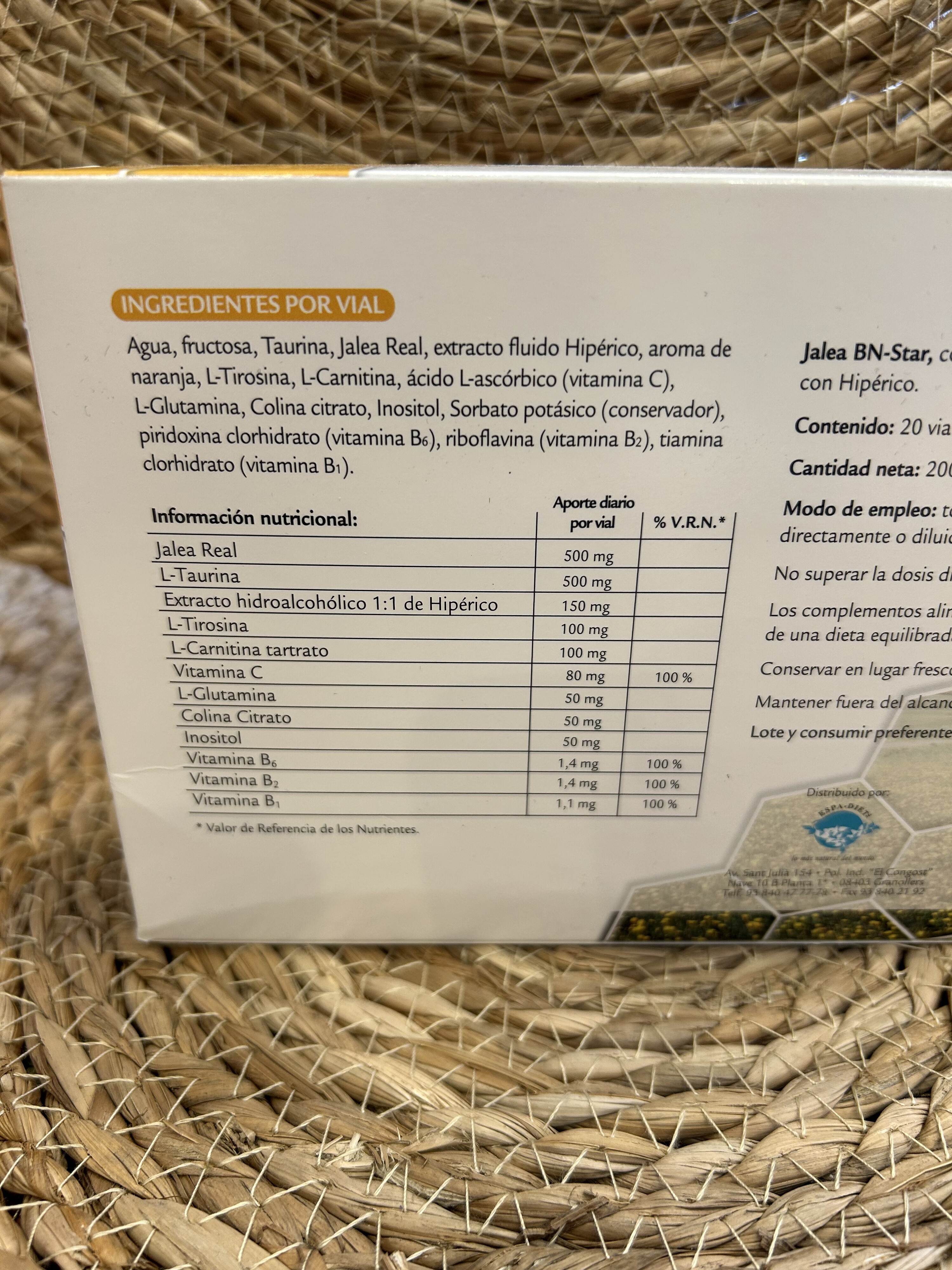 Ingredientes por vial: agua, fructosa, Taurina, Jalea Real, extracto fluido de Hipérico, aroma de naranja, T-Tirosina, L-Carnitina, ácido L-ascórbico (vitamina C), L-Glutamina, Colina citrato, Inositol, Sorbato potásico (conservador), piridoxina clorhidrato (vitamina B6), roboflavina (vitamina B2), tiamina clorhidrato (vitamina B1).