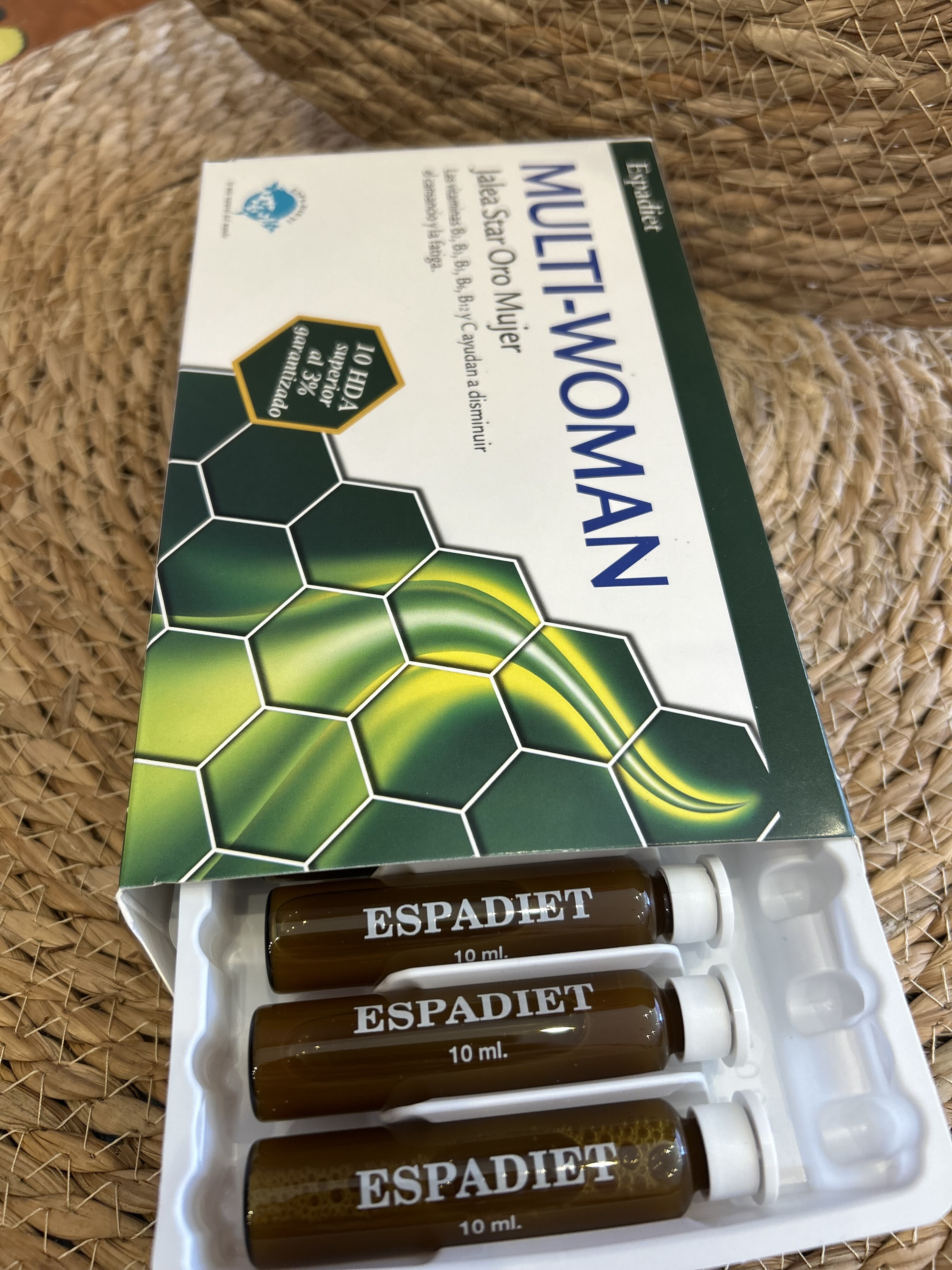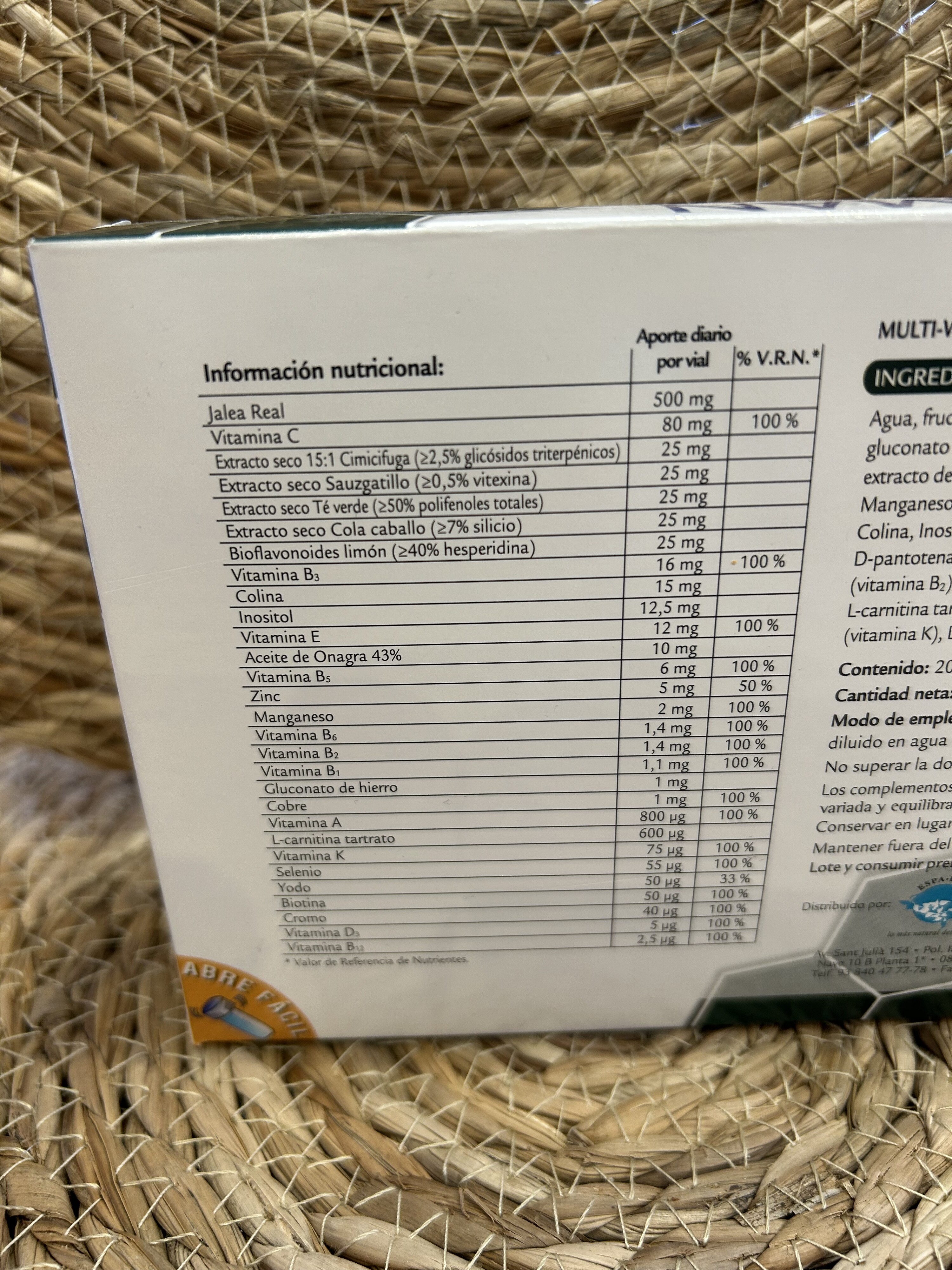 Ingredientes por vial: agua, fructosa, Jalea Real, glutamato de hierro, ácido L-ascórbico (vitamina C), gluconato de Magnesio, gluconato de Zinc, extracto de Címicifuga, extracto de Agnus castus, extracto de Té verde, extracto de Cola de caballo, bioflavonoides de cítricos, gluconato de Manganeso, aroma de naranja, conservador (sorbato potásico), Nicotinamida (vitamina B3), Colina, Inositol, acetato de DL-α-tacoferilo (vitamina E), aceite de Onagra, gluconato de Cobre, D-pantotenato cálcico (vitamina B5), clorhidrato de Piridoxina (vitamina B6), Riboflavina (vitamina B2), clorhidrato de Tiamina (vitamina B1), acetato de Retinilo (vitamina A), L-carnitina tartrato, yoduro potásico, picolinato de Cromo, selenito sódico, Fitomenadiona (vitamina K), D-biotina, Colecalciferol (vitamina D3), Cianocobalamina (vitamina B12).