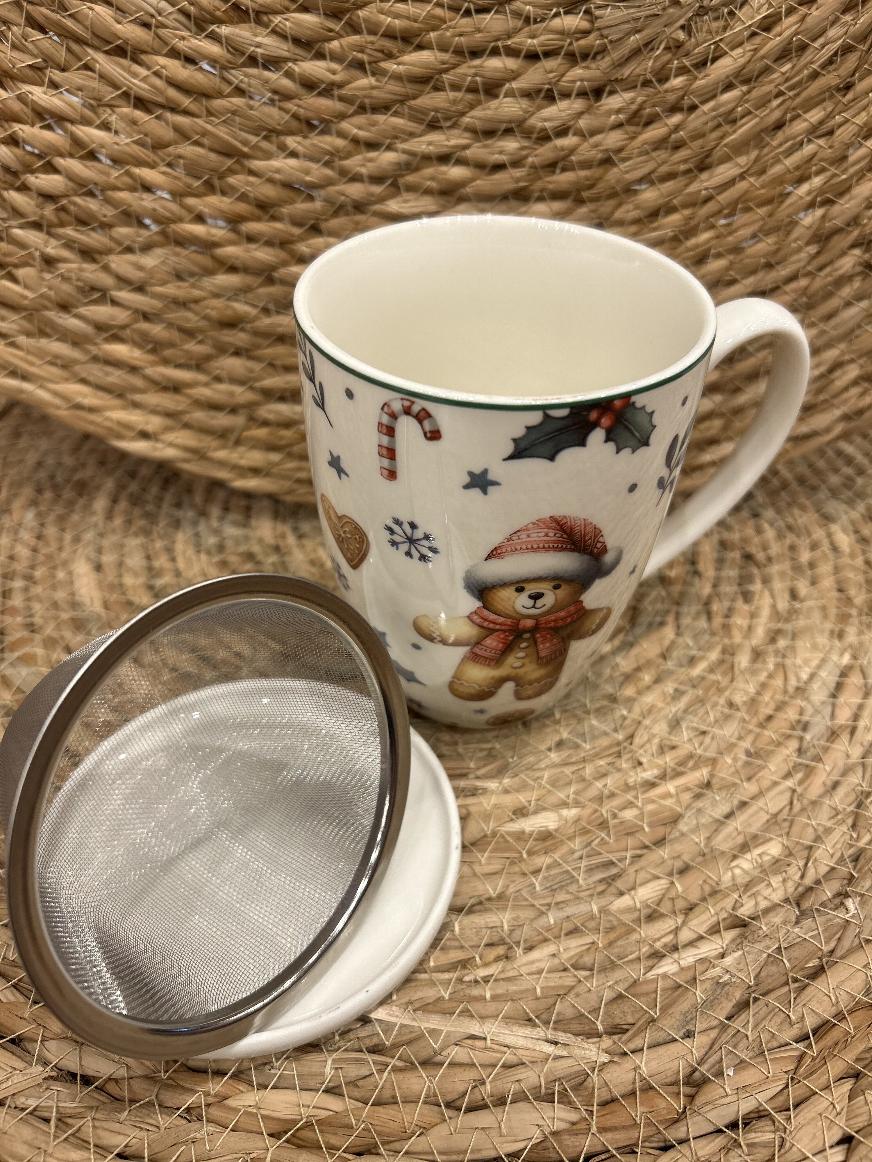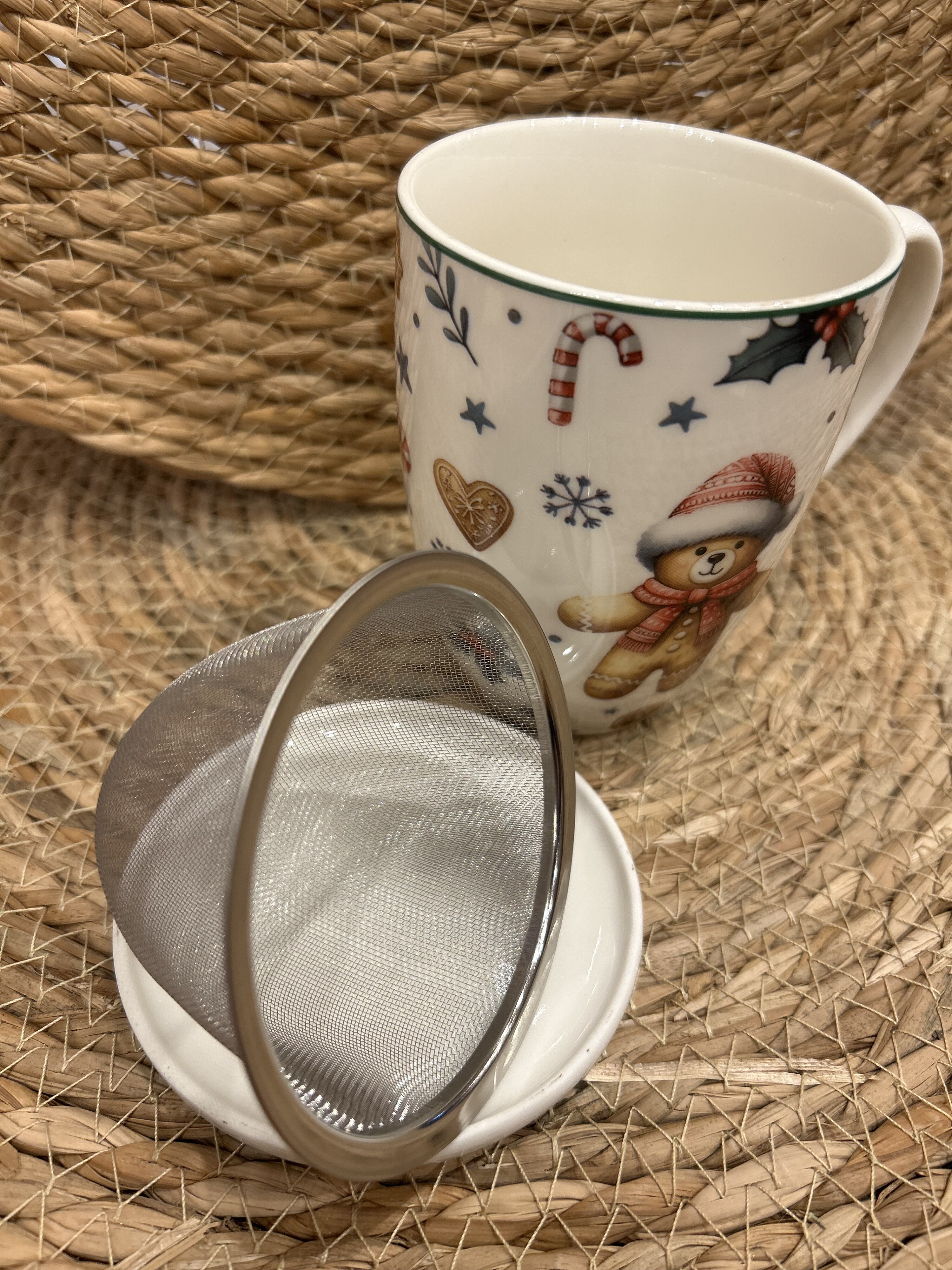 Taza de porcelana fina con diseño de osito navideño, con filtro de acero inoxidable y tapa.