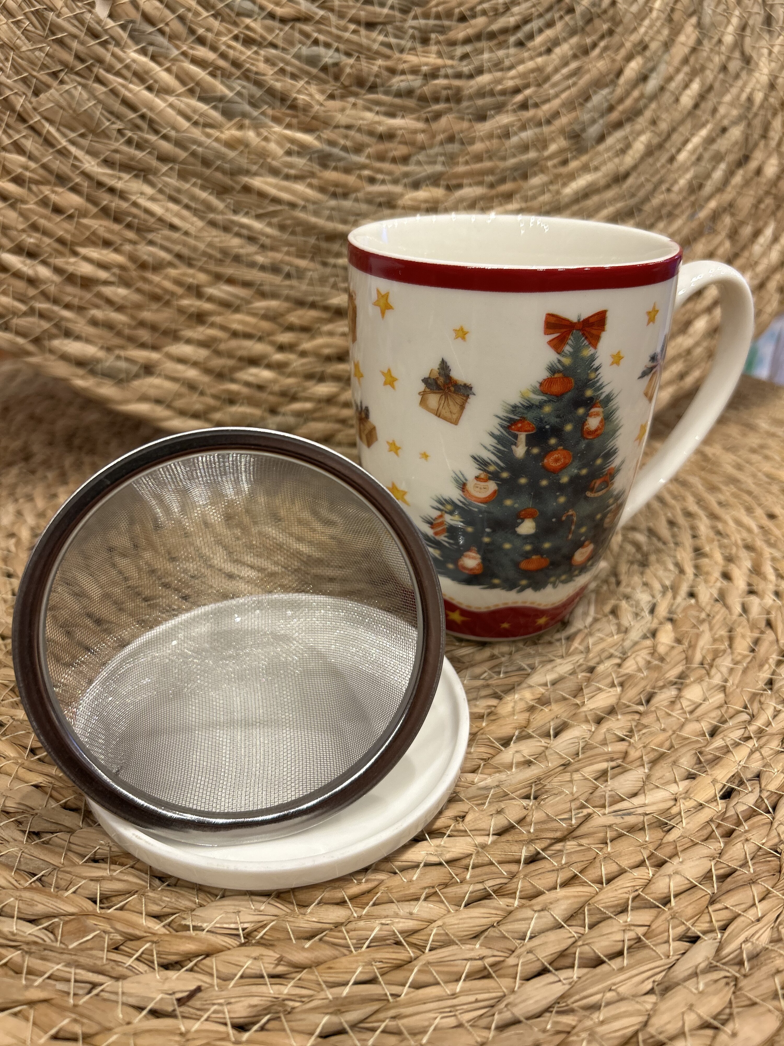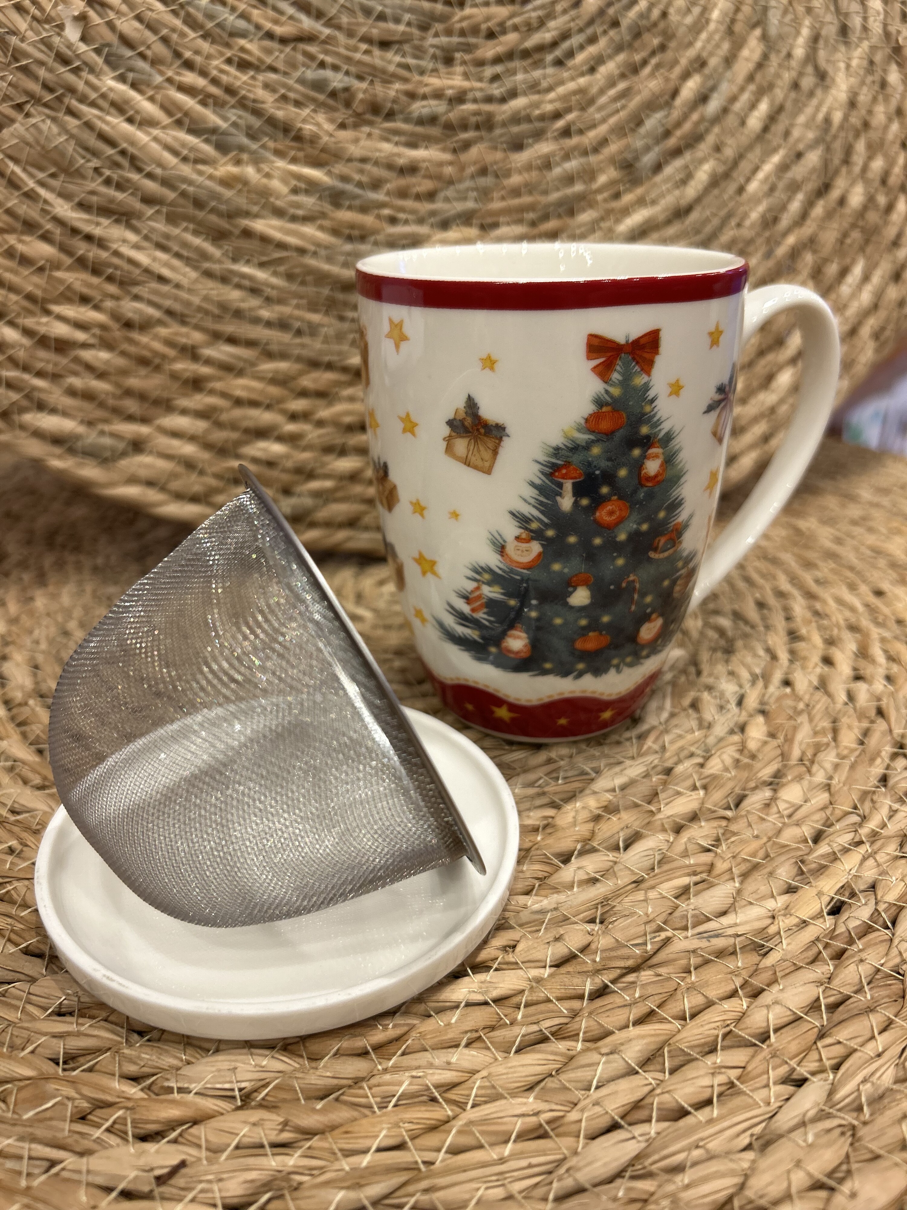 Taza de porcelana fina con diseño de árbol de navidad, con filtro de acero inoxidable y tapa.