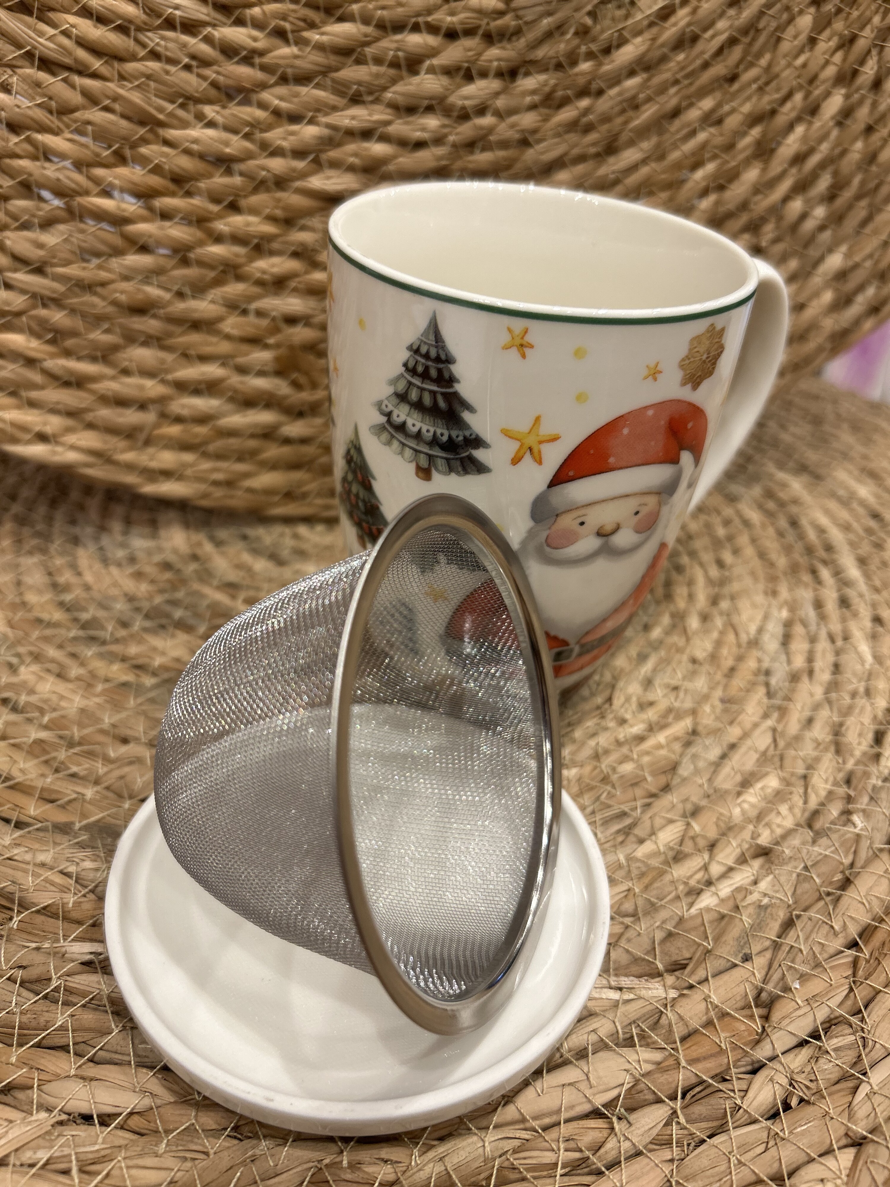 Taza de porcelana fina con de Papá Noel, con filtro de acero inoxidable y tapa.