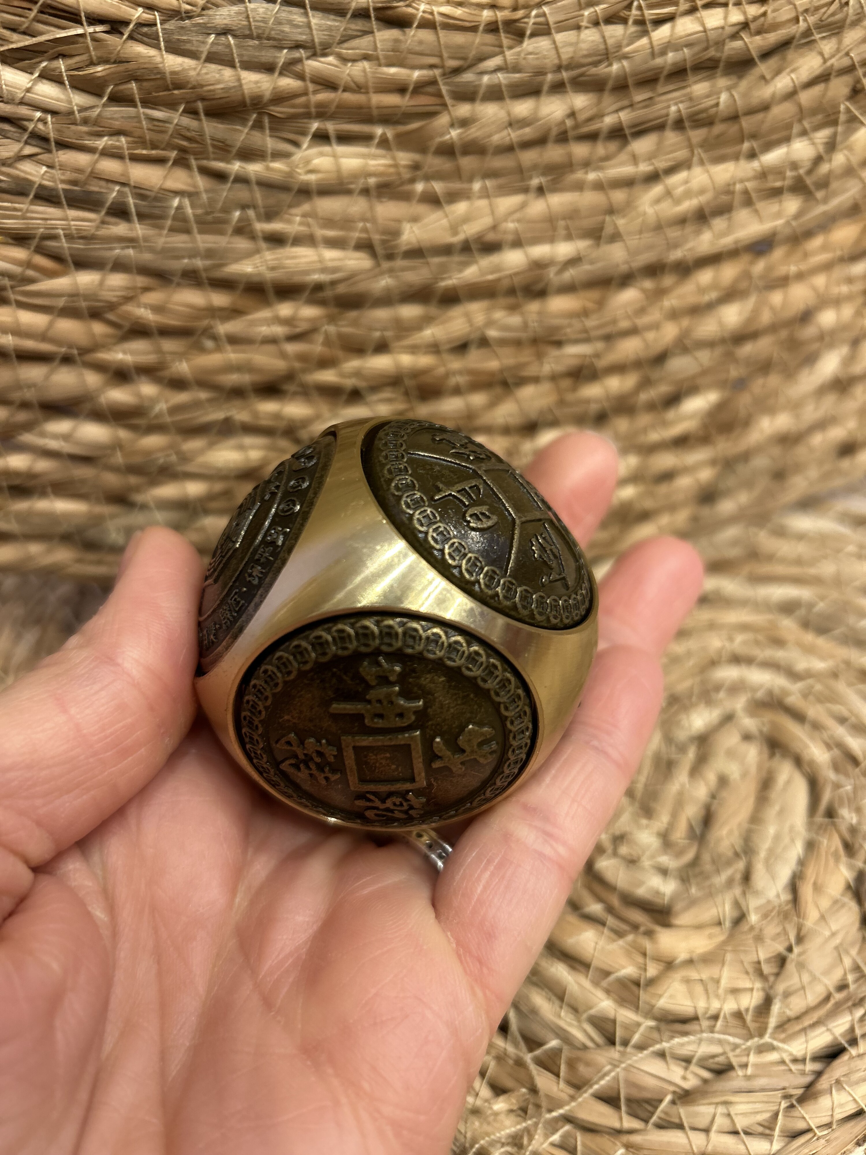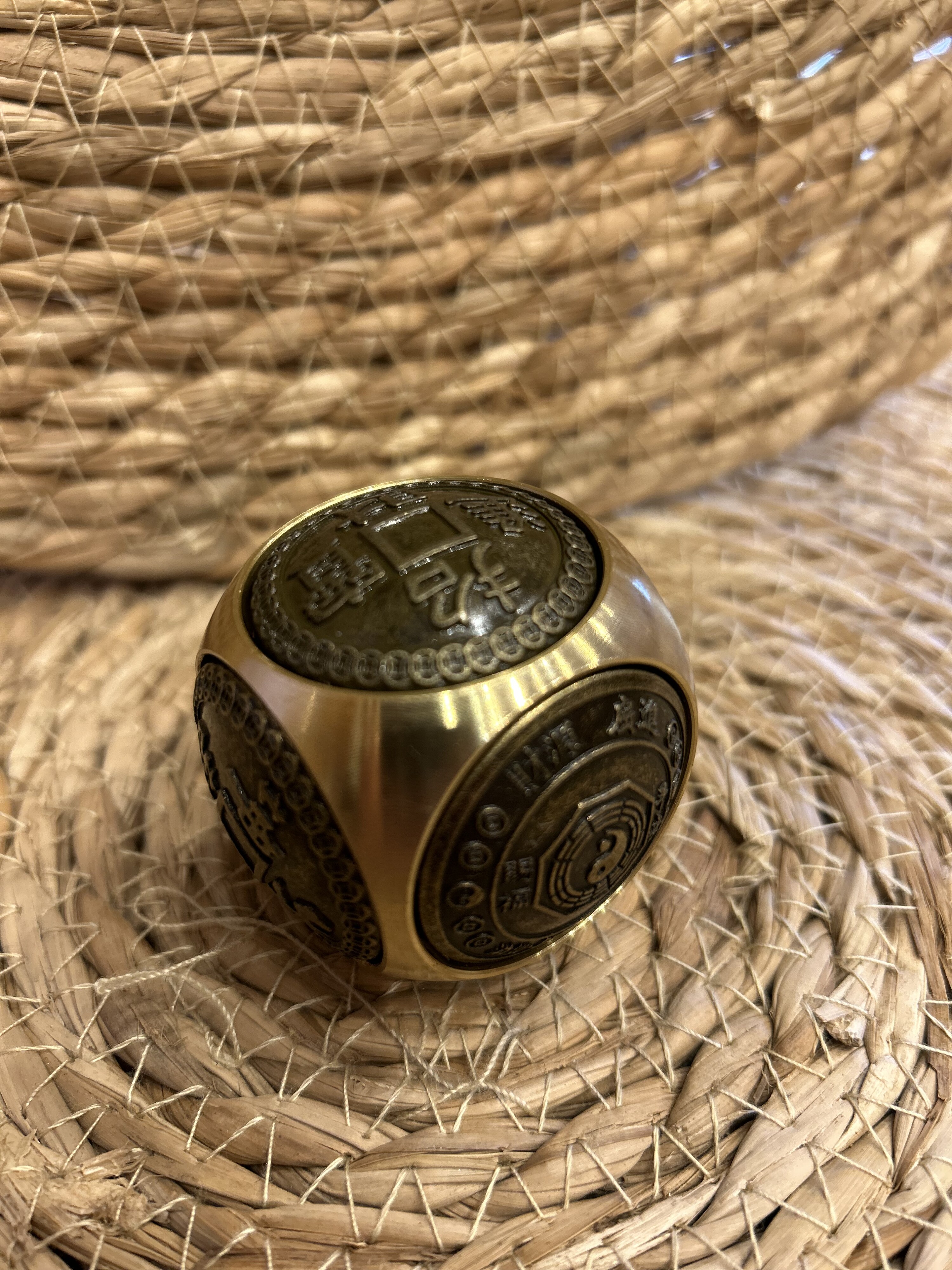 Hecho de latón, metal considerado poderoso en Feng Shui por su energía Yang (masculina, protectora).