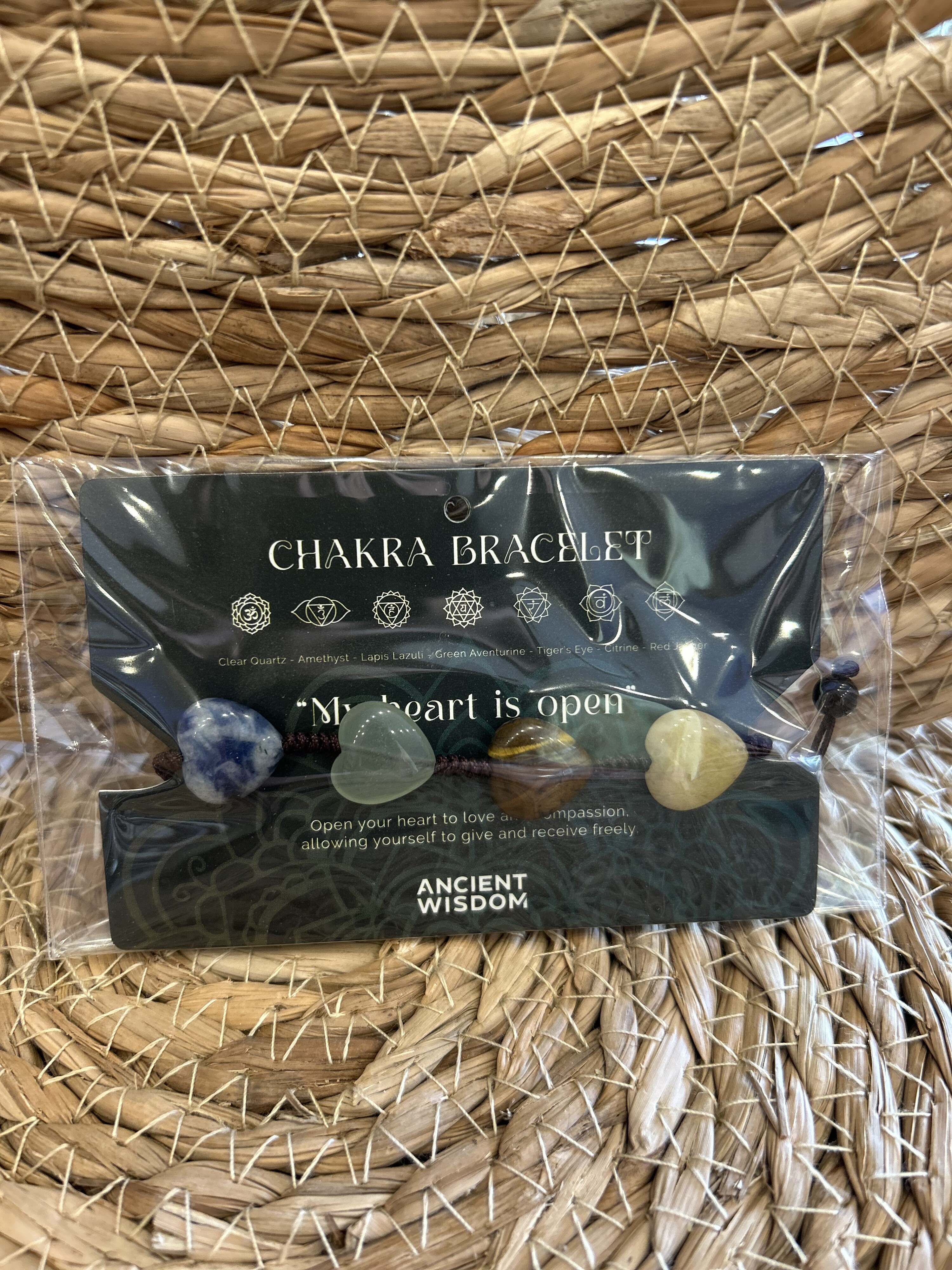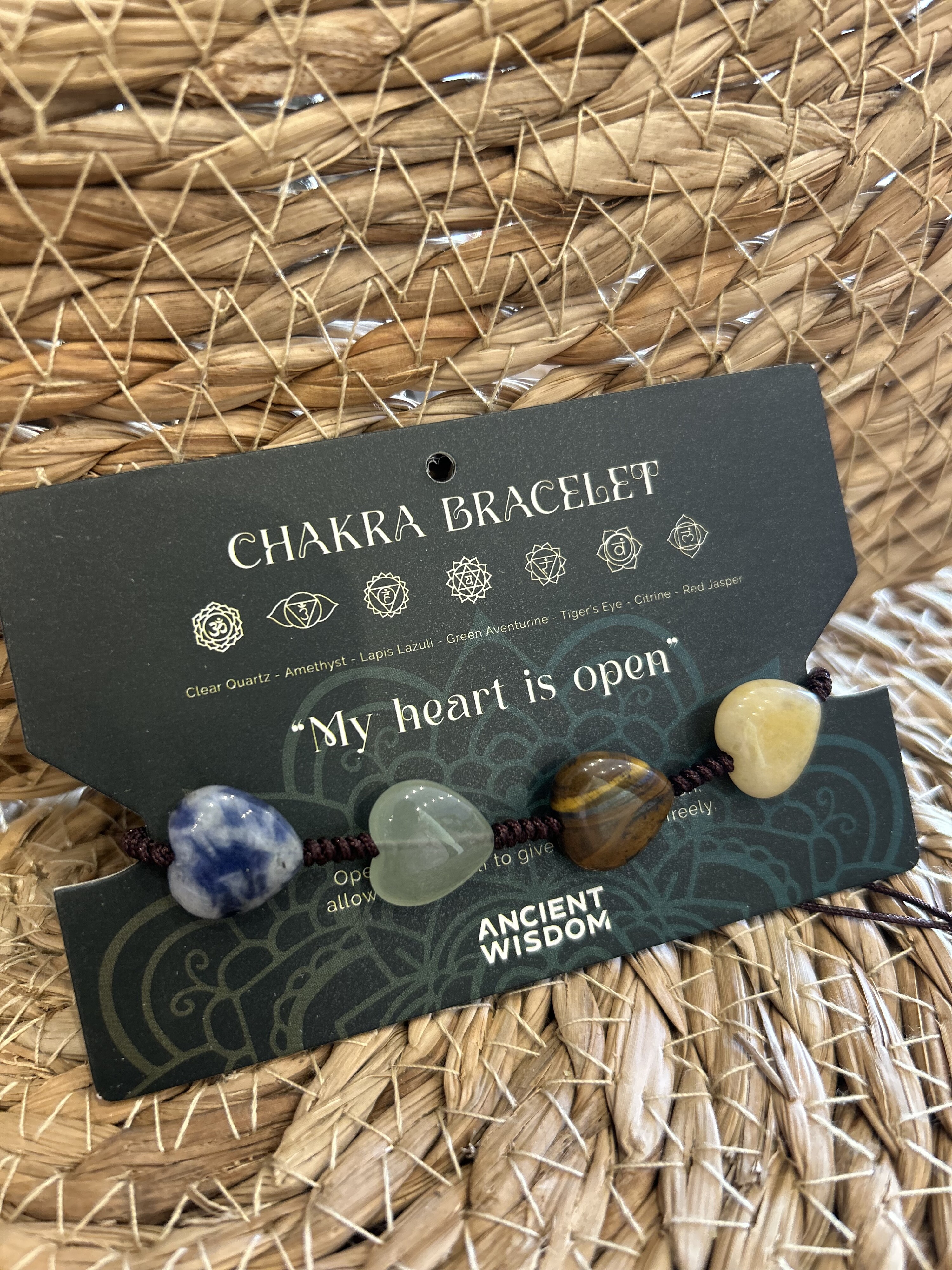 Pulsera ajustable de color marrón con los 7 chakras en forma de corazón representados por 7 minerales naturales diferentes correspondientes a cada uno de los 7 chakras.