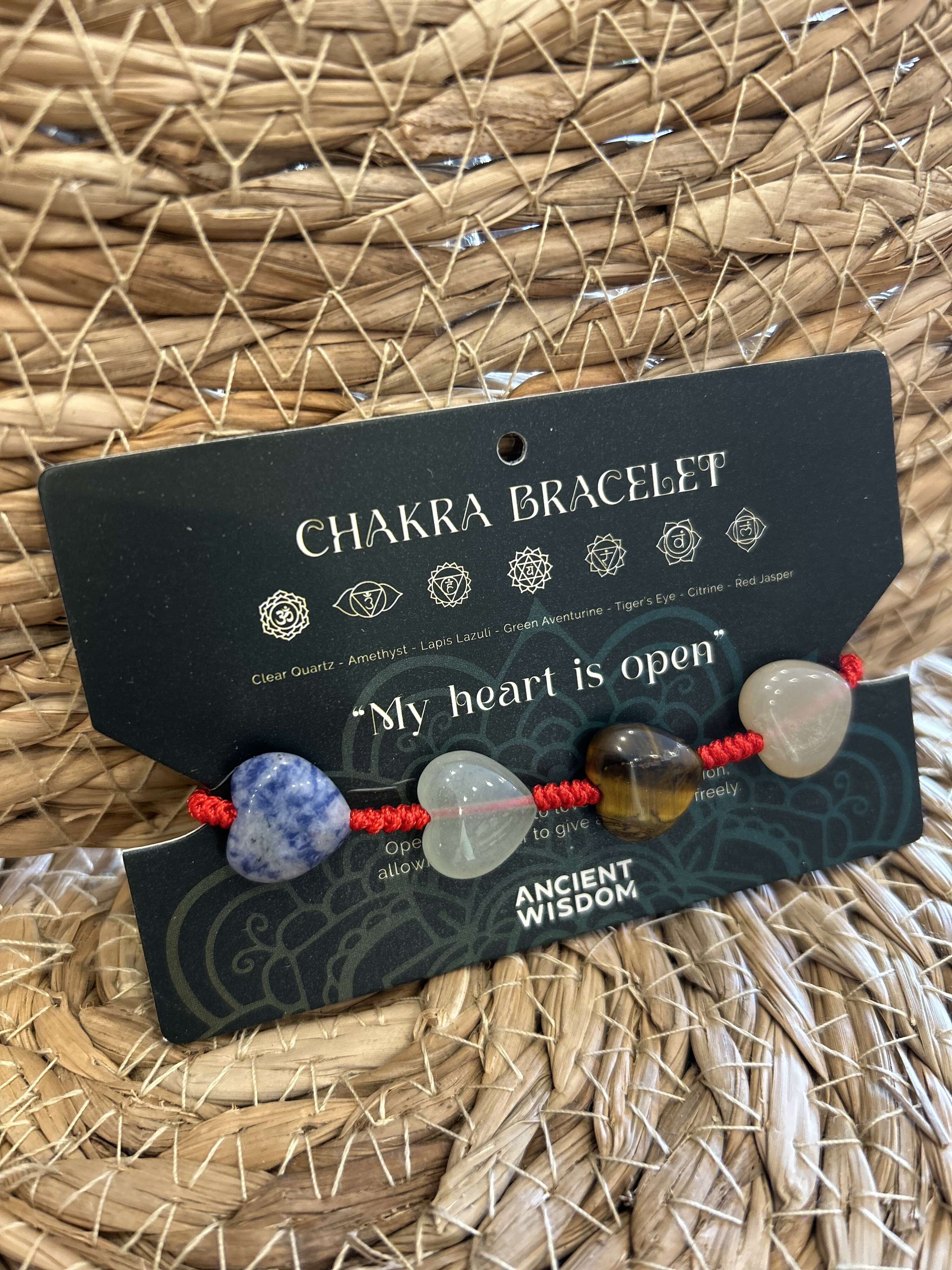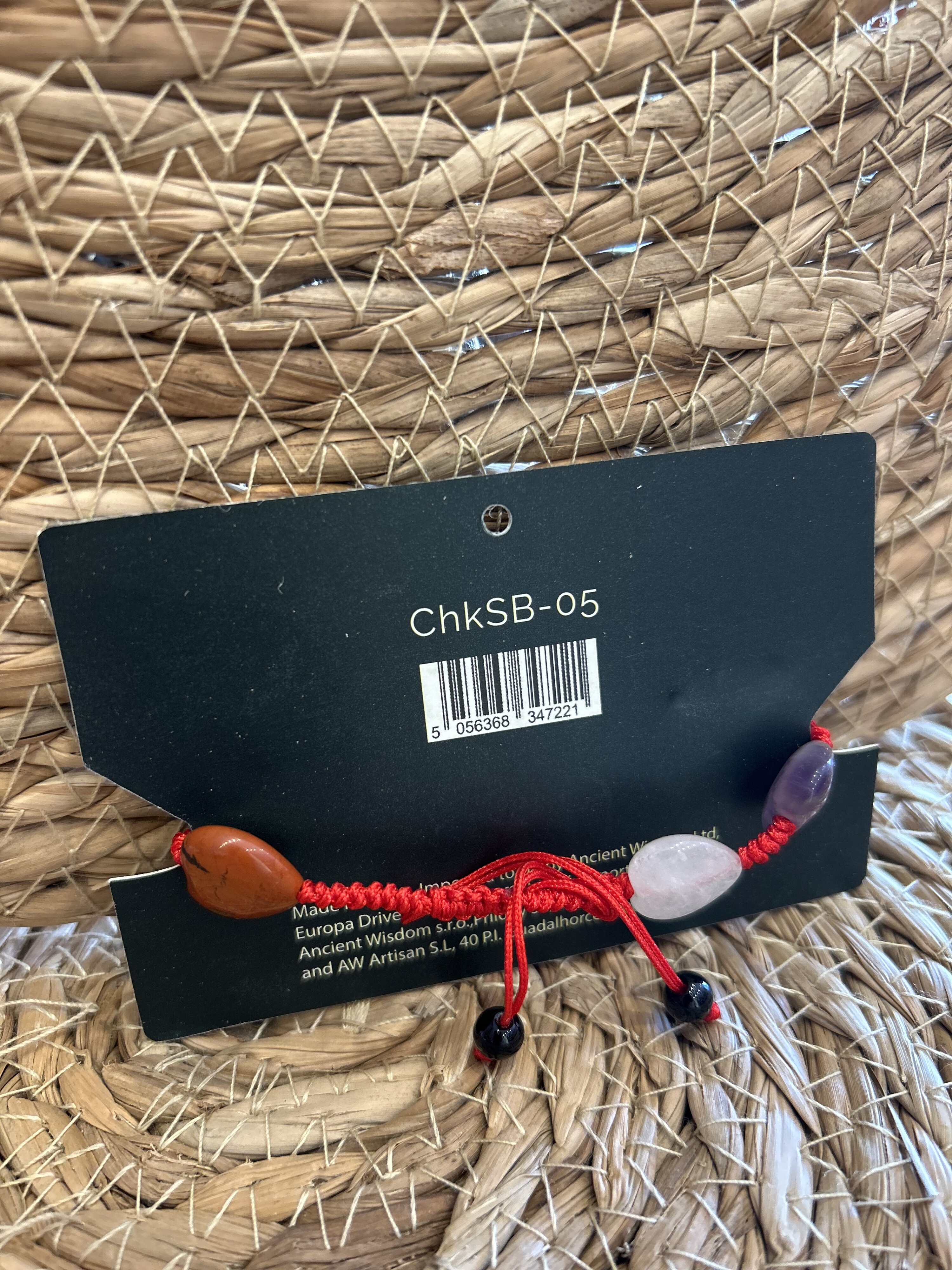 Pulsera ajustable de color rojo con los 7 chakras en forma de corazón representados por 7 minerales naturales diferentes correspondientes a cada uno de los 7 chakras.